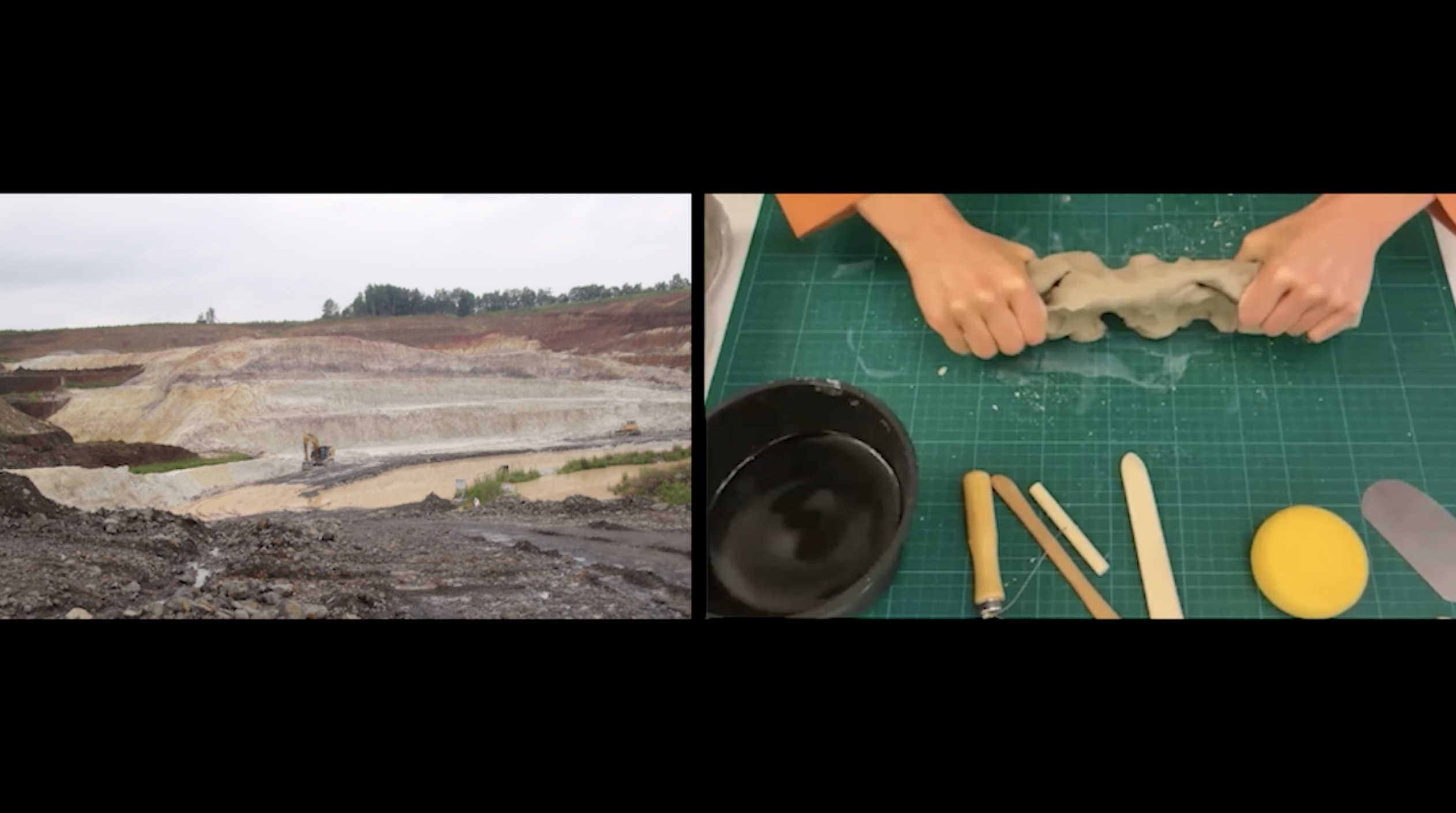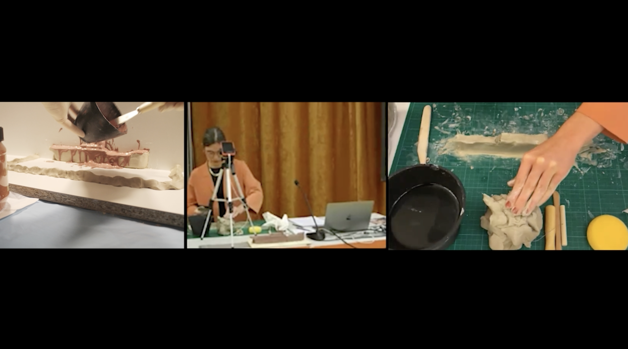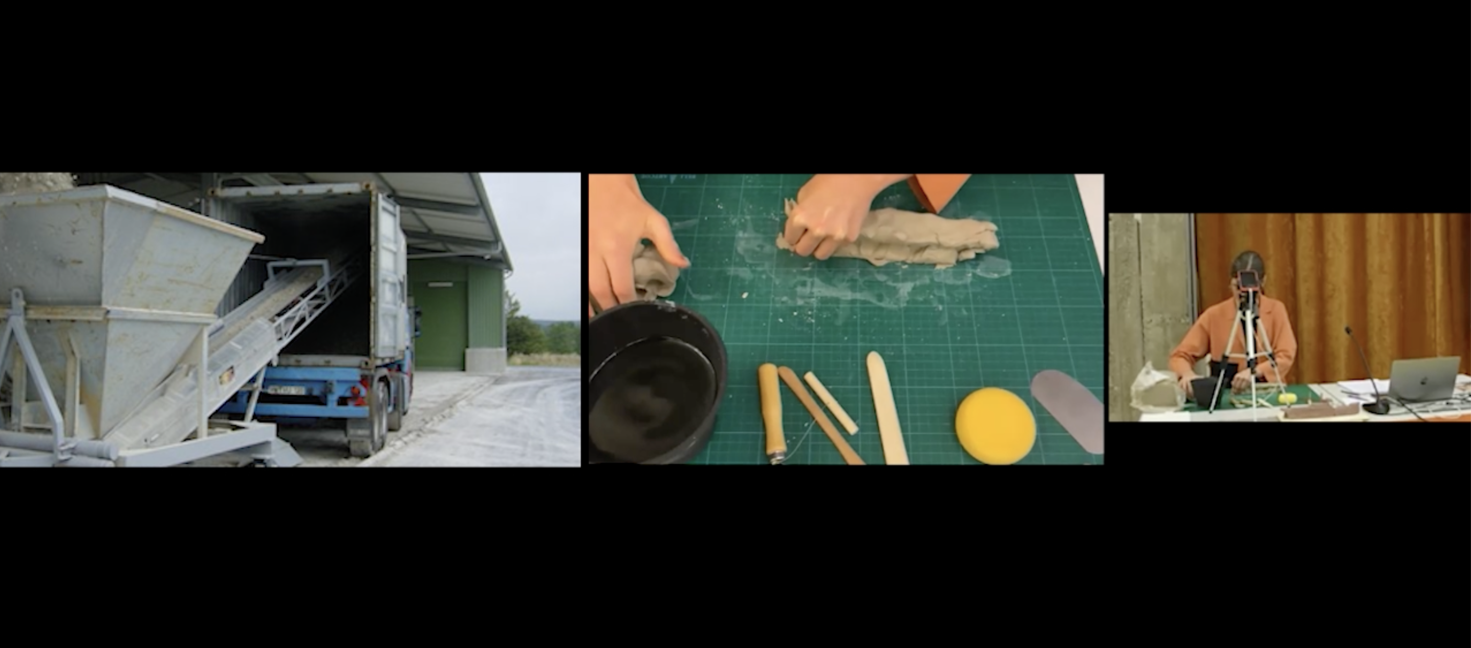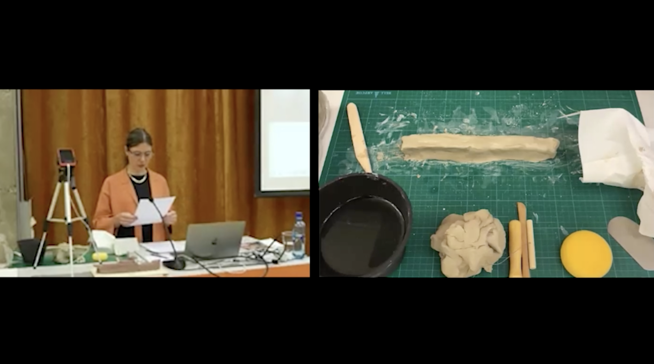 The trailer presented in this visual contribution is an excerpt from a performance-lecture developed as part of my PhD research. This approach was my response to the Oslo School of Architecture and Design's requirement for PhD candidates to deliver a trial lecture on the day of their public defense (fig. 1). Two weeks before my disputation, the committee assigned me the title for my lecture: 'Performing Material Dramaturgy in Architectural Education: A Demonstration Lecture.’ In my response, I worked with clay, modeling, and a pre-recorded voiceover, using the lecture format itself as a medium for animating material—thinking quite literally with my hands. By disrupting the conventional structure of a lecture, I created a space that was both playful and hybrid, offering a form of participation that made making a model an act of engagement with materials (fig. 2). As Cérèzo states, “the form of the performance-lecture enables an ongoing interplay between theory and practice, between the thinking and the making and between the making and reflection.” This interplay is at the heart of what the performance lecture does—where the boundaries between theory and practice blur, allowing material to “speak” and co-design with us.